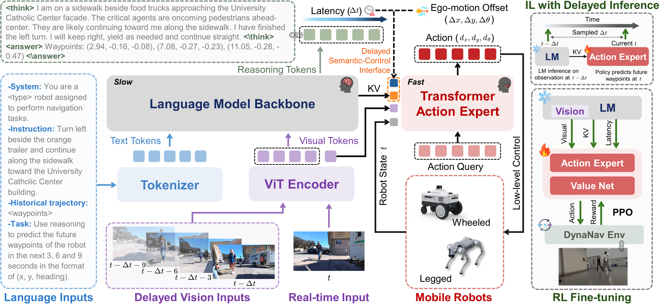 We introduce Think-in-Control (TIC)-VLA, a latency-aware framework that explicitly models delayed semantic reasoning during action generation. TIC-VLA defines a delayed semantic-control interface that conditions action generation on delayed vision-language semantic states and explicit latency metadata, in addition to current observations, enabling policies to compensate for asynchronous reasoning. We further propose a latency-consistent training pipeline that injects reasoning inference delays during imitation learning and online reinforcement learning, aligning training with asynchronous deployment. To support realistic evaluation, we present DynaNav, a physics-accurate, photo-realistic simulation suite for language-guided navigation in dynamic environments.